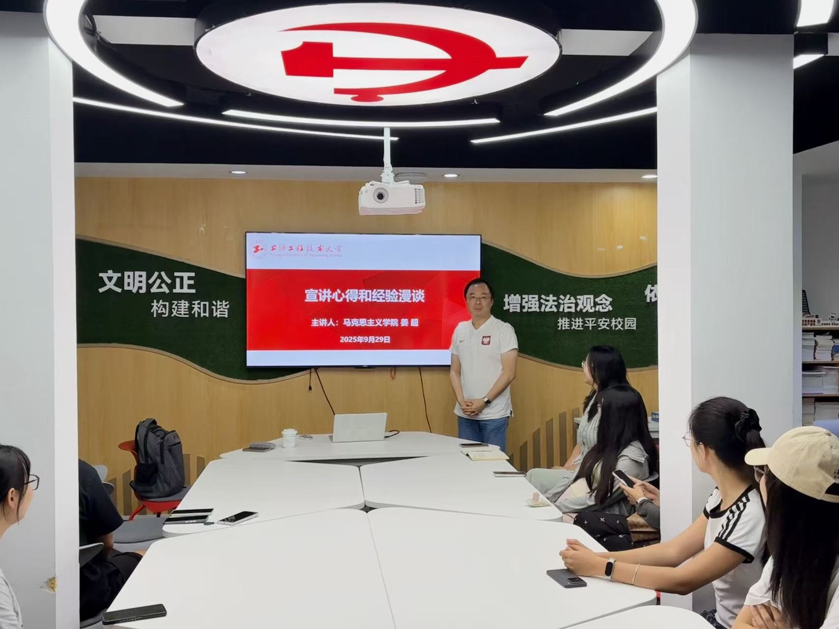 姜超老师以“宣讲经验分享和宣传指导”为核心,紧扣宣讲前期筹备的关键需求,从课件制作、现场宣讲技巧、宣讲内容把控三大维度展开深入讲解。他结合自身参与市级宣讲、教学竞赛的丰富实践经历,深入浅出地解读课件“简洁化、逻辑化、淡雅化、生动性”的设计原则,针对现场宣讲中易出现的“紧张怯场、内容记忆不牢”等问题提供实用应对方法,同时强调材料选取需注重真实性、宣讲内容要平衡历史与现实关联、观点表达须严谨审慎。整场分享兼具理论指导性与实操性,宣讲团成员全程专注聆听,在案例分析与技巧交流中深受启发,为后续完善宣讲准备、提升宣讲质量积累了扎实经验。随后的互动环节,宣讲团成员积极提问,就宣讲中的实际困惑与姜超老师深入交流,老师逐一耐心解答,给出具体指导。