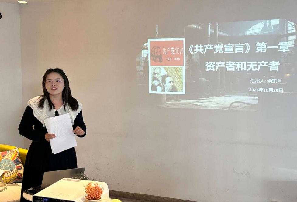 10月29日,马克思主义学院在程园共享学习中心开展青马读书会《共产党宣言》研读课堂第二讲,2025级研究生及青马研习社成员参加活动,余凯月老师带领大家共同学习《共产党宣言》第一部分:资产者和无产者。