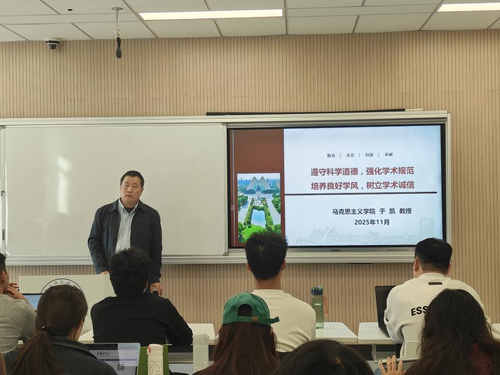 为强化学术规范和加强科研诚信建设,引导学生恪守科学道德、坚守诚信底线,11月5日,马克思主义学院在教学楼C407召开主题为“遵守科学道德,强化学术规范 培养良好学风,树立学术诚信”的学术讲座。会议由马克思主义学院副院长于凯教授主讲,学院2025级全体学生参加会议。