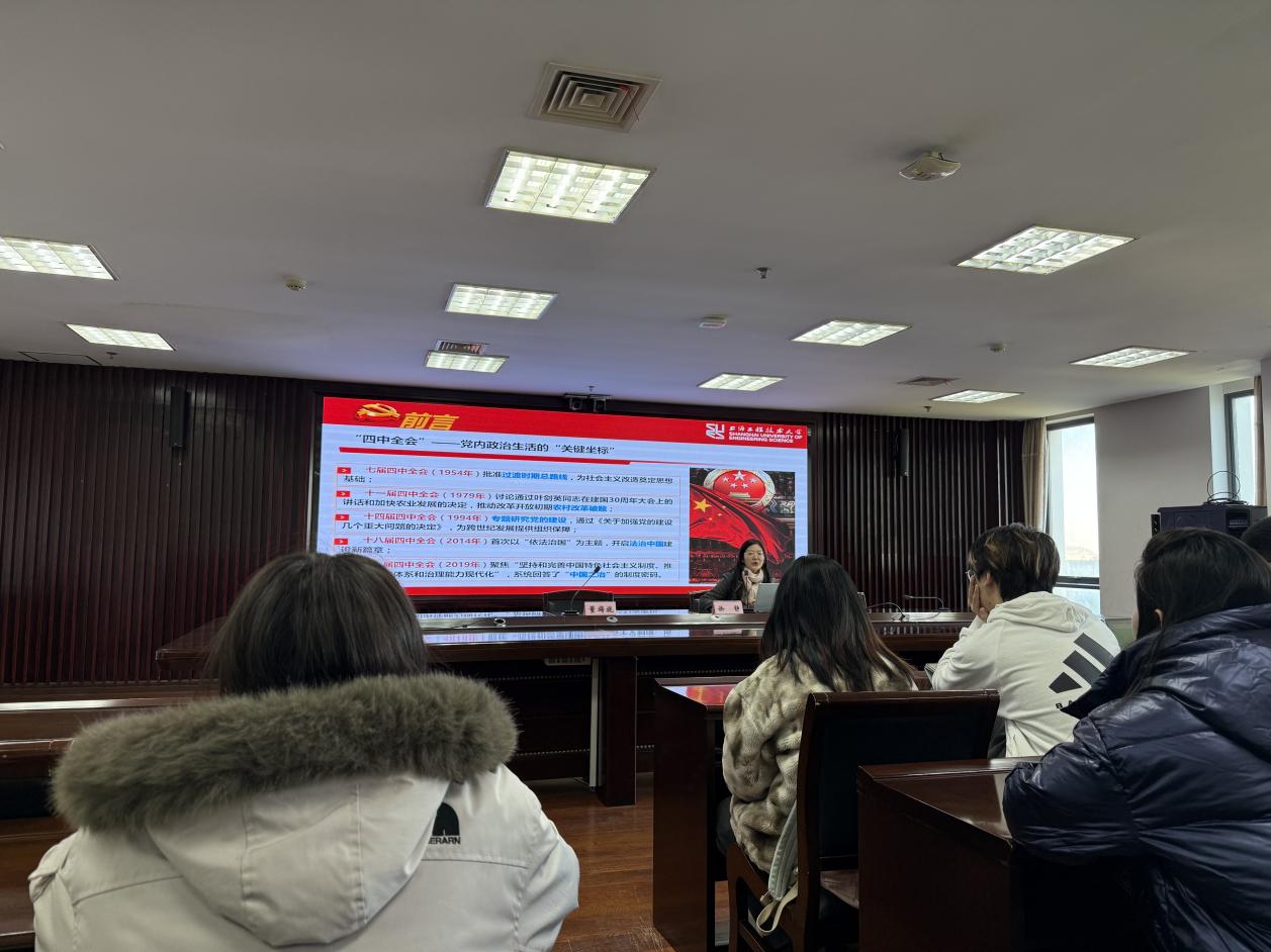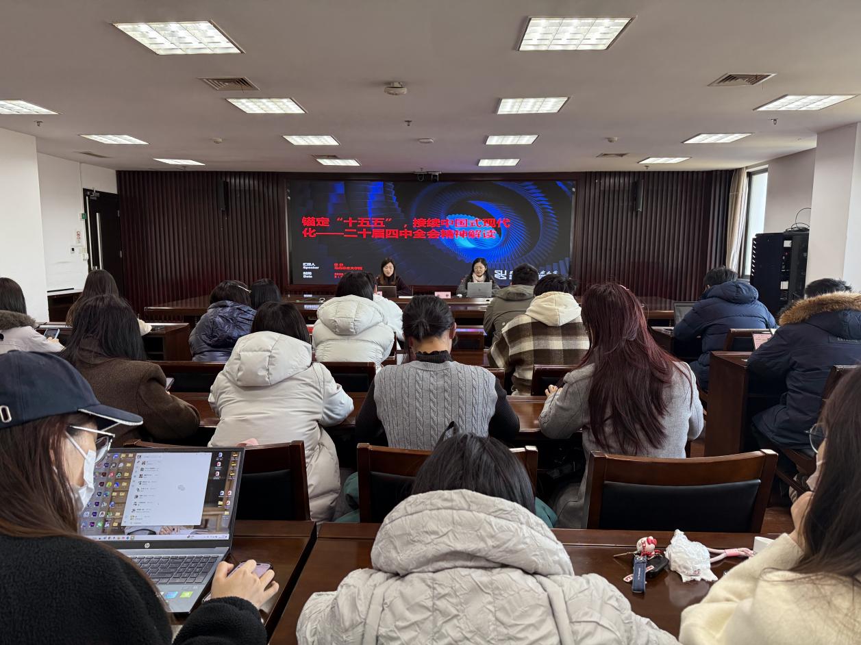 12月4日,“锚定‘十五五’,接续中国式现代化”党的二十届四中全会精神讲座在行政楼506室顺利举办。本次讲座由马克思主义学院党委书记董旖旎主持,学院副教授徐静担任主讲人,马克思主义学院、管理学院、化学化工学院等六所学院师生代表共同参会,在思想碰撞中凝聚起奋进新征程的共识。