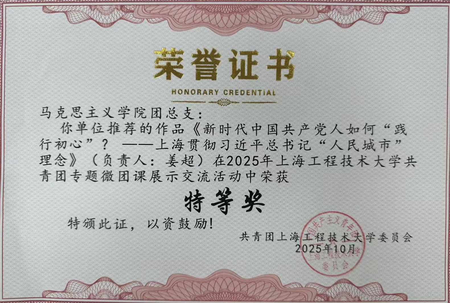 姜超老师负责的《新时代中国共产党人如何“践行初心”?——上海贯彻习近平总书记“人民城市”理念》在2025年上海工程技术大学共青团专题微团课展示交流活动中荣获特等奖