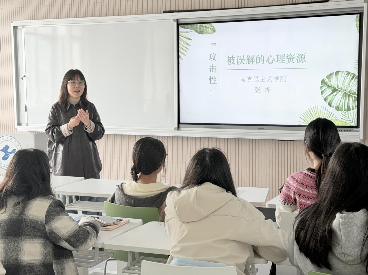 讲座伊始,张烨老师以“攻击性”这一常被负面理解的心理特质为切入点,提出了一种全新的视角:攻击性并非单纯的破坏冲动,而是一种可以被觉察、接纳并转化为生命力量的心理资源。围绕这一核心观点,讲座从四个层面层层递进展开。张烨老师引导同学们思考:攻击性也是个体确立自我、维护尊严、推动成长的重要动力,压抑攻击性往往意味着对自我力量的削弱。她鼓励同学们在接纳自身焦虑与攻击冲动的前提下,勇敢面对现实挑战,将内在的张力转化为行动的力量。