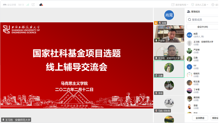 2月12日晚,正值春节将至之际,马克思主义学院通过腾讯会议平台举办2026年度国家社科基金项目选题线上辅导交流会。会议特邀教育部“万人计划”名师、二级教授、国家社科基金资深评审专家、安徽师范大学马克思主义学院博士生导师王习胜教授担任指导专家,为学院教师提供一对一选题把脉与申报思路优化。院长严运楼主持会议,全体拟申报教师共50余人参会。
